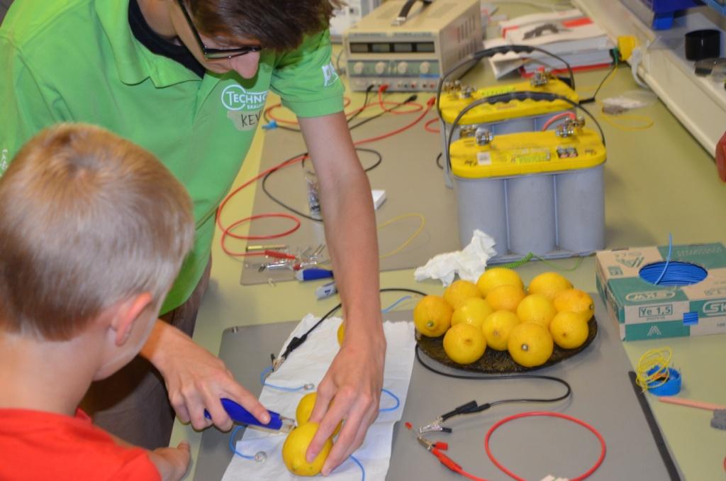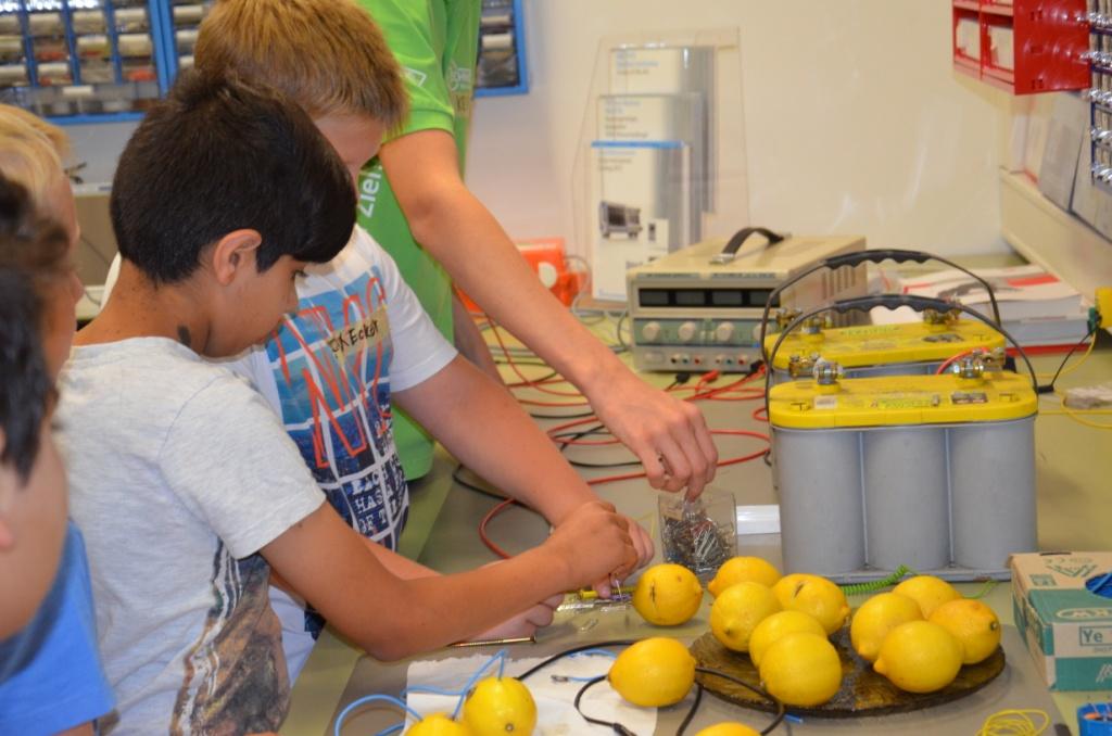 Den ganzen Vormittag über drehte sich alles um das Thema Strom, weshalb erst einfache Fragen wie „Was ist Strom“, „woher kommt Strom“ usw. anhand von Plakaten kindergerecht erklärt wurde. Um anschaulich zu machen wie vielfältig das Thema ist, wurden den Kindern einige Experimente wie die „Zitronenbatterie“, wobei mithilfe von mehreren Zitronen eine LED zum Leuchten gebracht wurde, gezeigt. Außerdem wurde die Leitfähigkeit von Wasser überprüft und durch Zugabe von Salz optimiert. Mit einer selbstgebastelten Spule wurde aus einem Nagel ein Dauermagnet erzeugt und brachte die Kids zum Staunen. Uns war es dabei ein besonderes Anliegen, den Kindern klarzumachen, dass Strom zwar nützlich aber auch hochgefährlich ist und dass sie elektronische Geräte daher immer mit Vorsicht verwenden sollten.