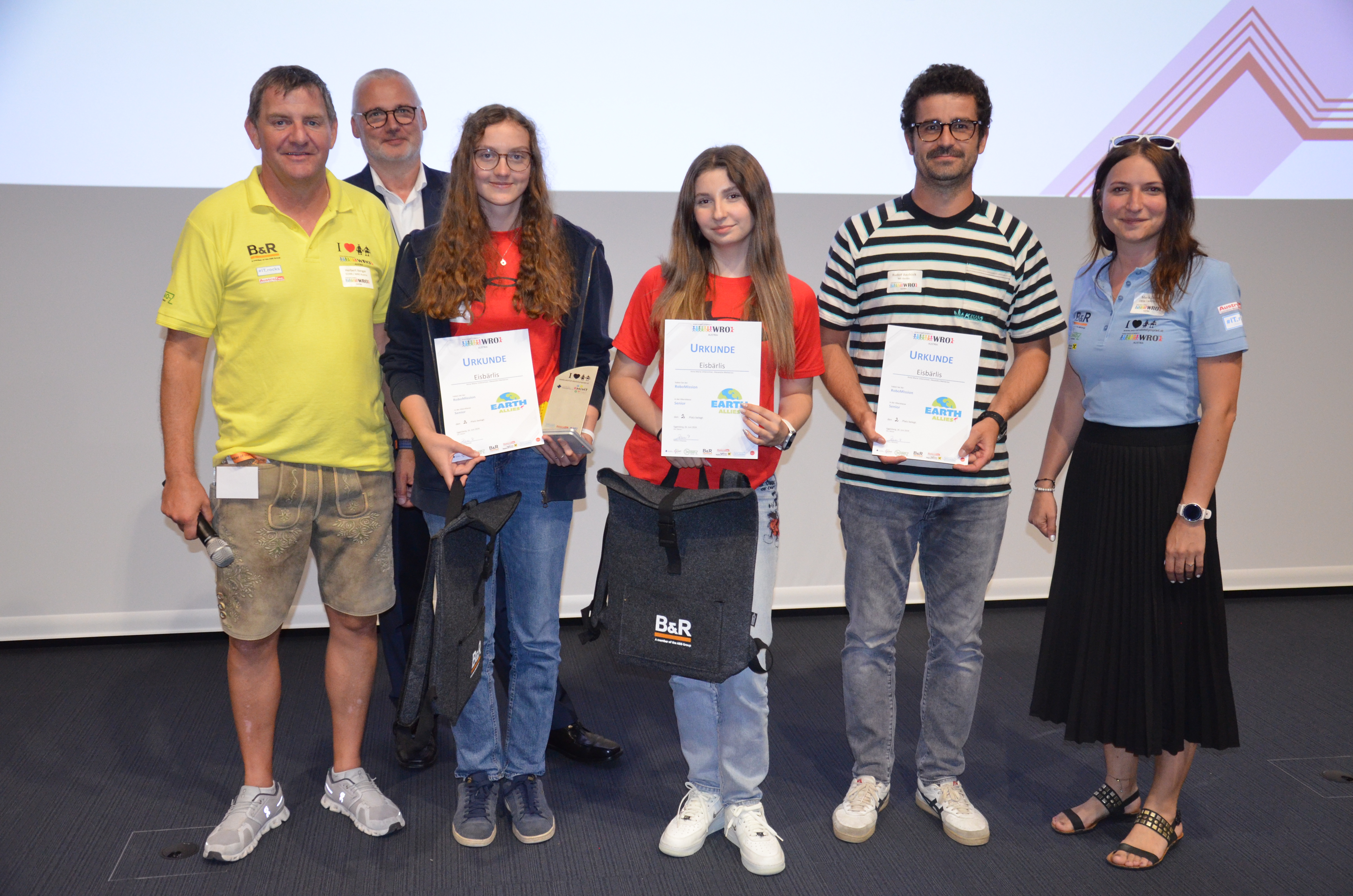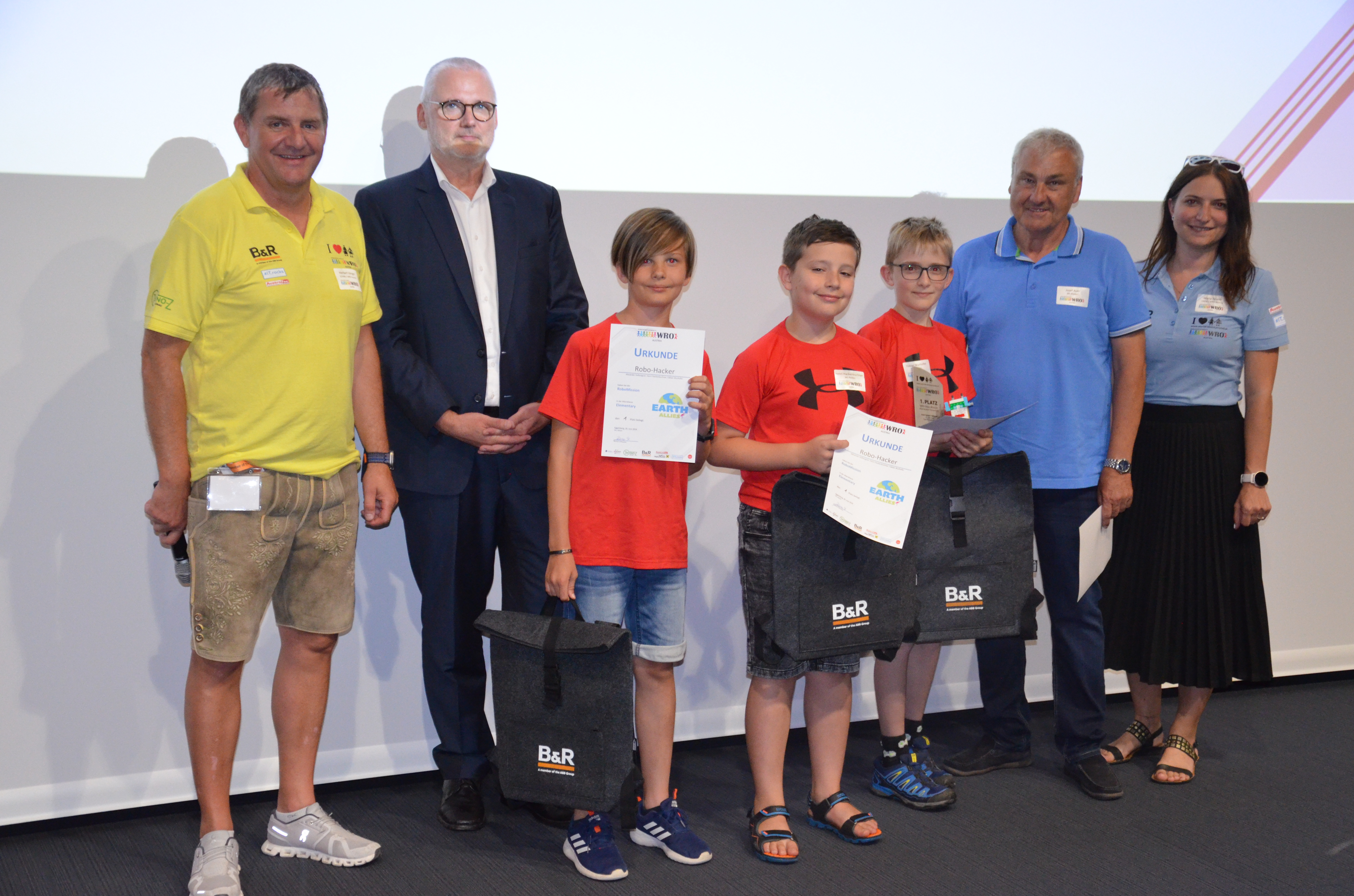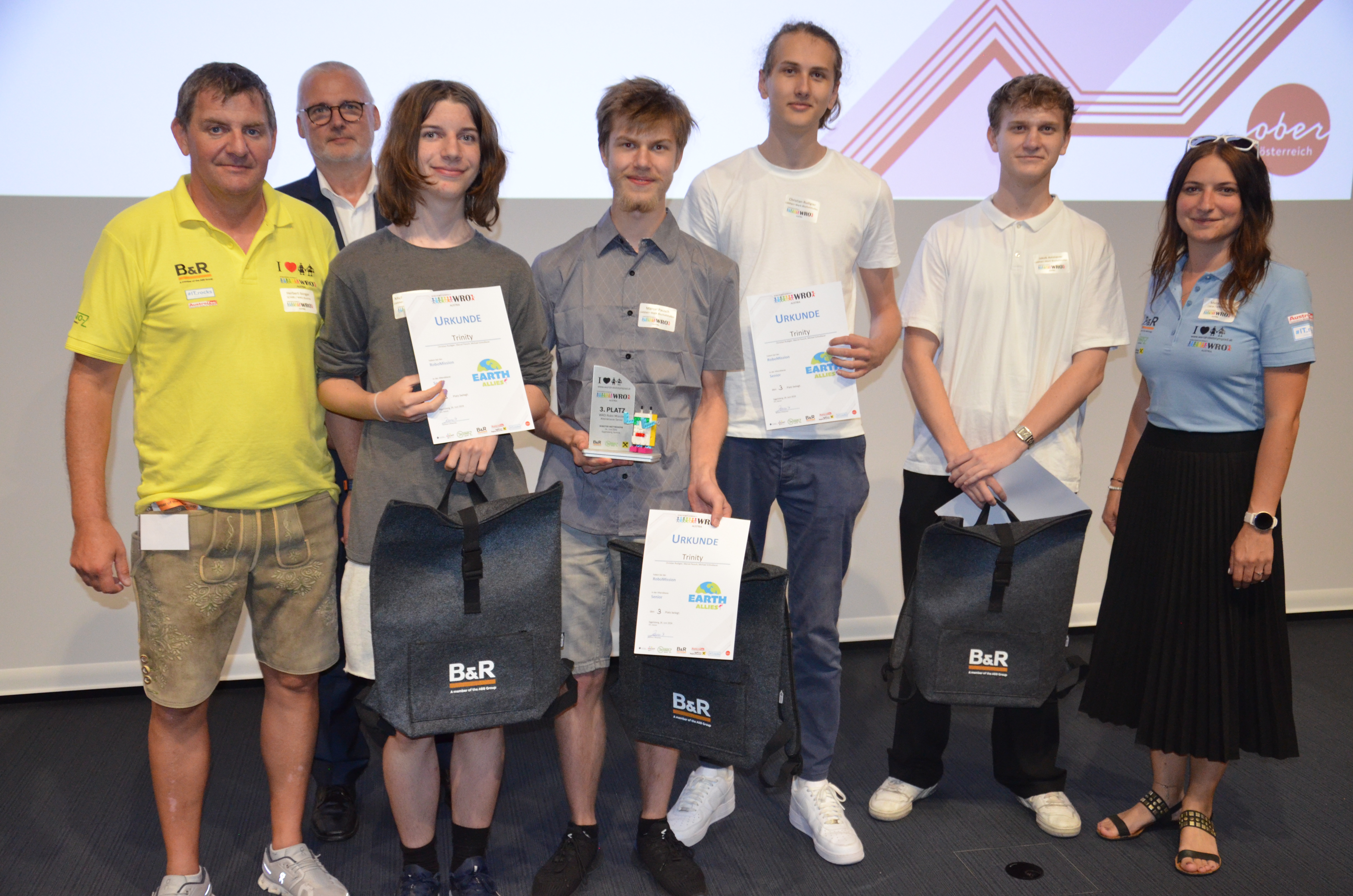 Unsere jungen Techniker wurden von DI (FH) Herbert Ibinger, Geschäftsleitung Techno-Z Braunau / National Organizer der WRO Austria und Maria Zauner, Assistenz der GF Techno-Z Braunau Organisatorin der WRO Austria, geehrt. Auch Jörg Theis, Geschäftsführer der Firma B&R Industrial Automation gratuliert den Schülerinnen und Schülern zu ihrem Erfolg.